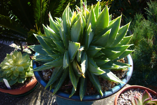 The second plant is one given to me a friend after I managed to kill all my seedlings.  We both got seeds from the same place at the same time, only he managed not to kill his. I am slowly getting better with seedlings due to my mangave hybrids and a few tests on random seeds, so maybe I'll have to try again.  Anyway it has been potted into a 30cm pot to give it one more year in which I can bring it inside.  I will probaly just place it where the plant will be in the new section of the rockery.