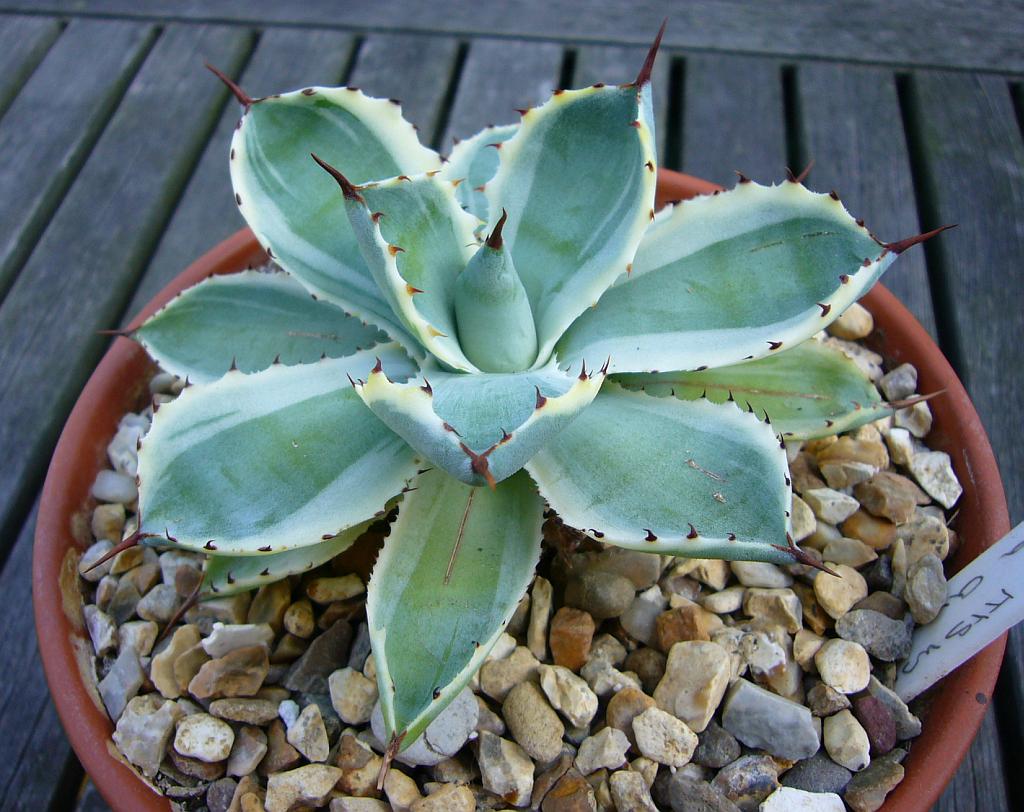 The other agaves that get brought inside are the variegated ones, the really rare ones go for silly money and there is a whole industry of producing new variegates. My current favourite (partly because it actually grows) is agave potatorum kissho kan marginata alba, this plant has all the characteristics I like in agaves; a very neat form, good spines, and it is compact so does not take up much space. If only all agaves were this fast growing, often I am reduced to marking one of the leaves at the start of the year to try to spot if they have grown any new leaves at all.