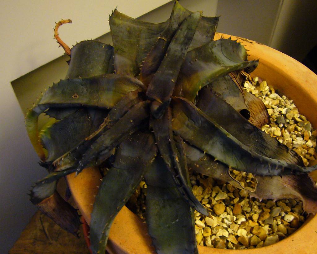 I am sad and puzzled in equal parts as I can not figure out what has happened. It looks like cold damage, but is inside. It has not been watered and the soil is totally dry. I have basically treated the same way as I have for the last two winters.