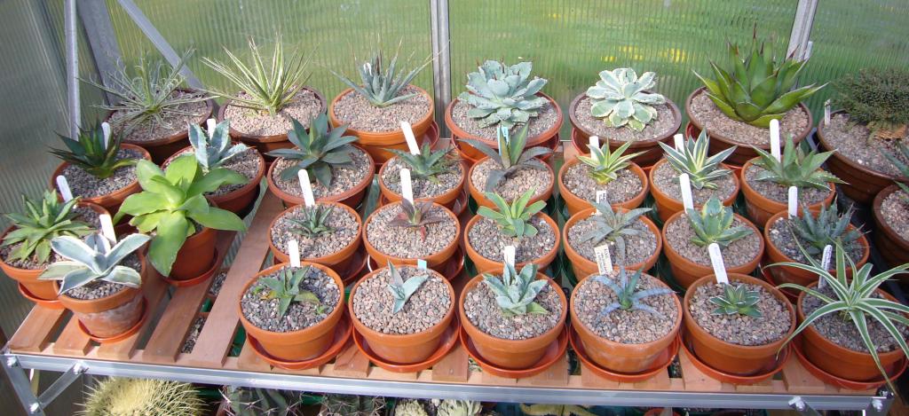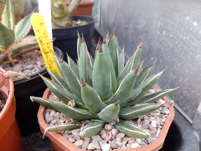 First up were the agaves, most don't need re-potting and it was easy to select those that would be given space. They very neatly fitted onto one bench, and with minimal cleaning up are ready for the growing season. Having them set out allowed me to go through checking for new pups and to photograph them . As always at this time of year new offsets are starting to show, or are discovered when plants are removed from their pots. I was also surprised how many hybrids/crosses I have, it wasn't a concious decision to buy hybrids, but they have been sneaking in.