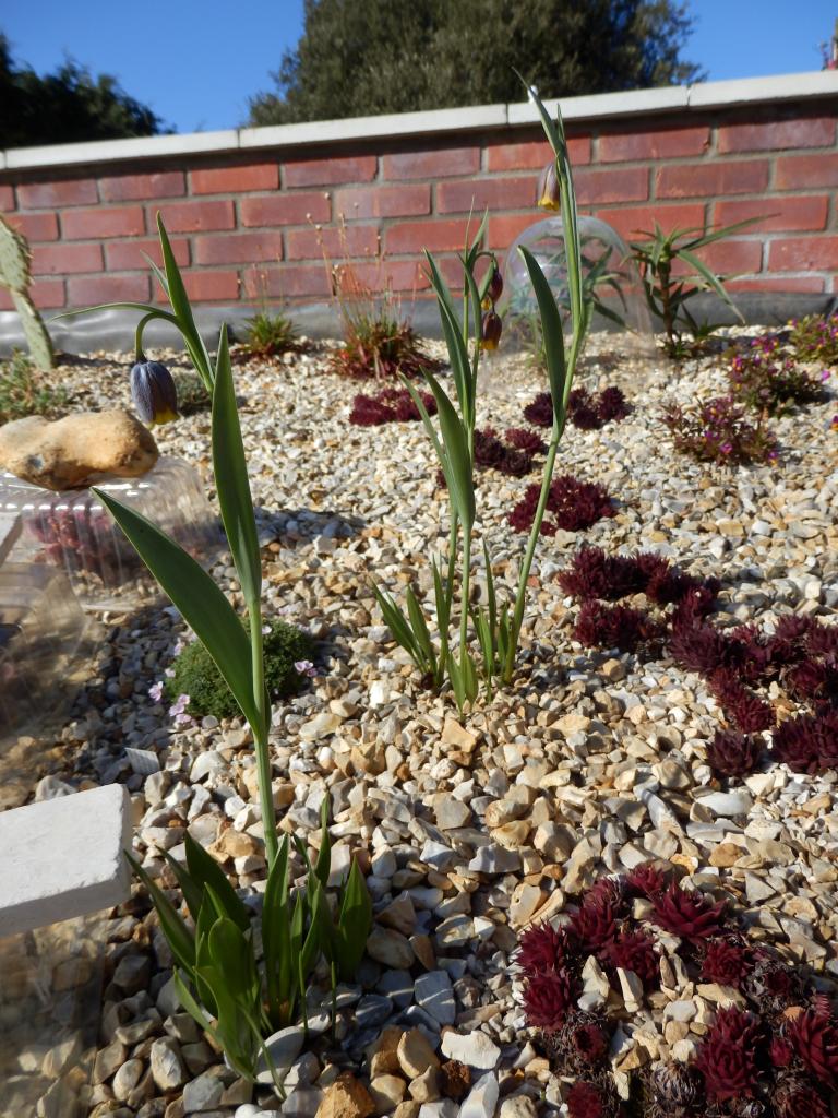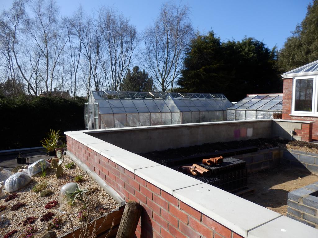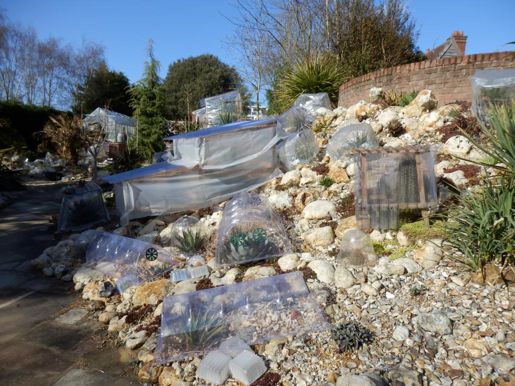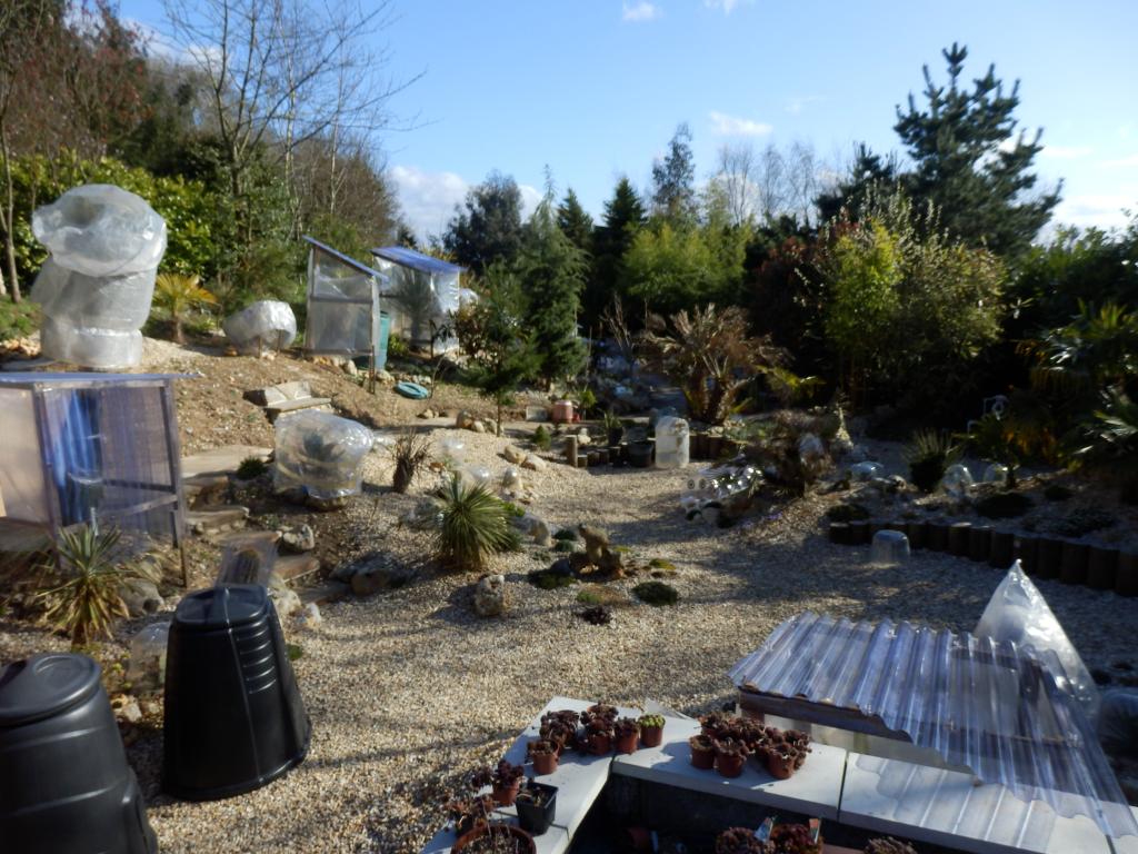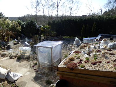 It is unfair to show the jungle and pond sections (to the front and left of the house), the ferns are not out and nothing is up, so I am concentrating on the new arid bits which are down the right hand side of the garden. When you come out of the side of the house you see the current project, or one of them, the sunken garden (the house is to the right of this picture). The building in the photo is the new cactus house and will all be planted. Neither of these were built this time last year, just the end wall with the lean-to greenhouse against it. The rest of the area was a sloping lawn / storage area.