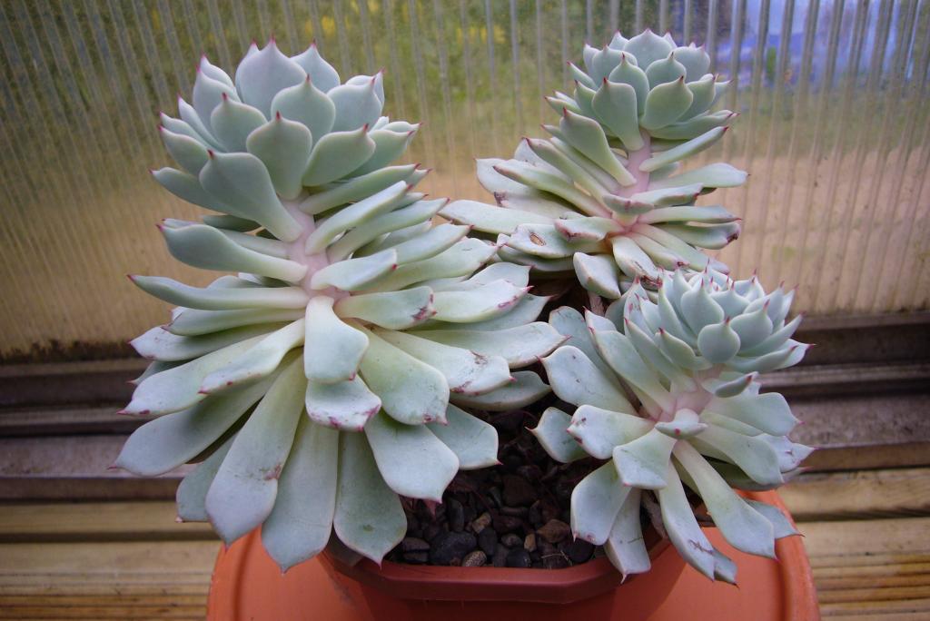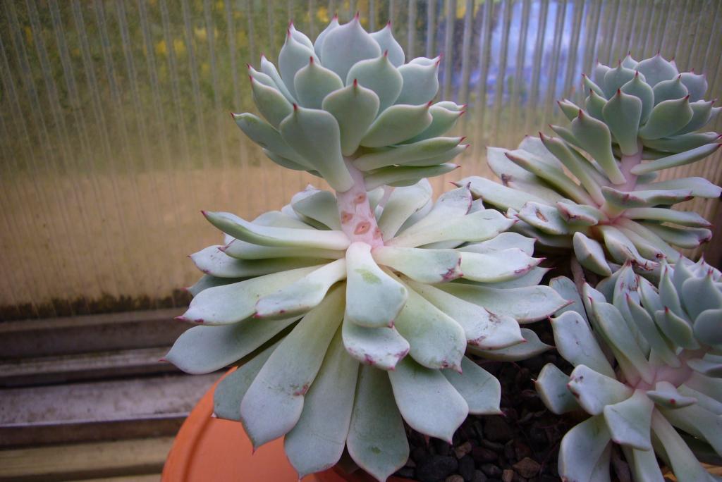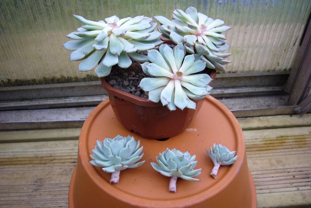 Stopping echeverias from growing over winter is not easy if you keep them inside; it is too warm and they just wont go to sleep. The results in leggy growth, which can totally spoil the look of rosette style plants. Take this little clump, they were lovely compact plants at the end of last summer, and are now all leggy.