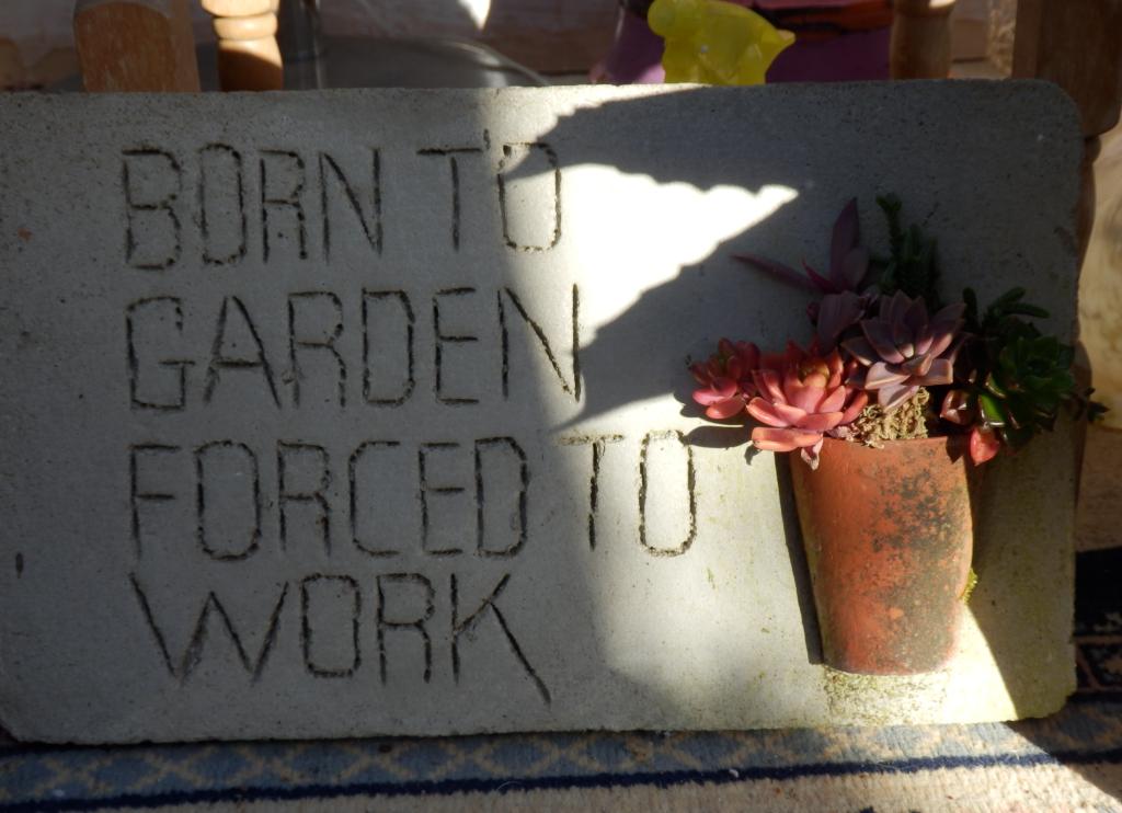 Finally one of the signs she has made for the garden, I like both the message and the way a pot has been encased and then planted up.