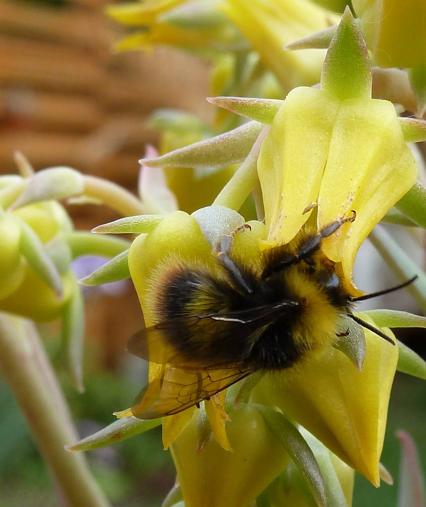 The bees have decided that echeverias are the flower of choice. You don't have to watch a plant for long before the next one comes along for a top up, often there are two or three on a plant at once. It is funny watching them trying to get into the delicate flowers, but they have worked out how to do it, going from flower to flower on a plant before moving off to the next one.
